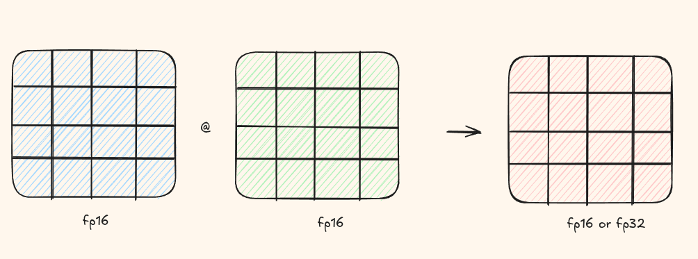 The WMMA API lets you perform \( D = A \times B + C \) at the warp level. A warp is a group of 32 threads, and together they cooperatively compute one matrix tile.